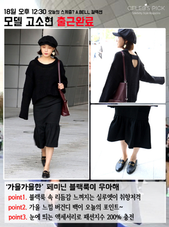 모델 고소현은 블랙룩에 포인트 아이템을 매치해 스타일리시한 출근길을 선보였는데요. 여유있는 실루엣에서는 움질일 때마다 우아한 리듬감이 느껴지고요, 버건디 숄더백으로 고급스러운 무드까지 더했습니다. 패셔너블한 모델 답게 뉴스 보이 캡, 클래식한 로퍼, 볼드한 메탈릭 이어링 같은 개성있는 액세서리를 믹스해 과하지 않으면서도 스타일리시한 포인트를 주었네요.