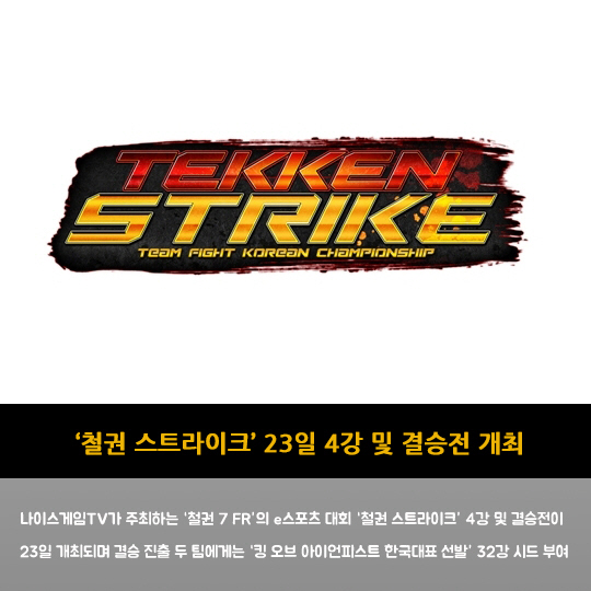 나이스게임TV가 주최하는 '철권 7 FR'의 e스포츠 대회 '철권 스트라이크' 4강 및 결승전이 23일 개최되며 결승 진출 두 팀에게는 '킹 오브 아이언피스트 한국대표 선발' 32강 시드 부여