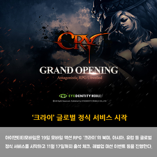 아이덴티티모바일은 19일 모바일 액션 RPG '크라이'의 북미, 아시아, 유럽 등 글로벌 정식 서비스를 시작하고 11월 17일까지 출석 체크, 레벨업 미션 이벤트 등을 진행한다.