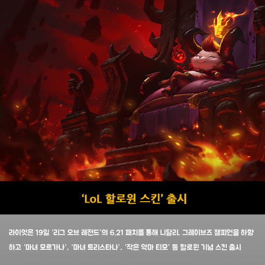 라이엇은 19일 '리그 오브 레전드'의 6.21 패치를 통해 니달리, 그레이브즈 챔피언을 하향하고 '마녀 모르가나', '마녀 트리스타나', '작은 악마 티모' 등 할로윈 기념 스킨 출시