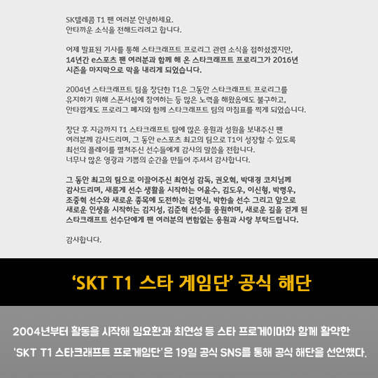 2004년부터 활동을 시작해 임요환과 최연성 등 스타 프로게이머와 함께 활약한 'SKT T1 스타크래프트 프로게임단'은 19일 공식 SNS를 통해 공식 해단을 선언했다.