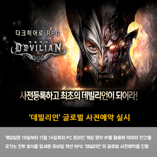 게임빌은 19일부터 11월 14일까지 PC 온라인 게임 원작 IP를 활용해 악마와 인간을 오가는 전투 방식을 앞세운 모바일 액션 RPG '데빌리언'의 글로벌 사전예약을 진행