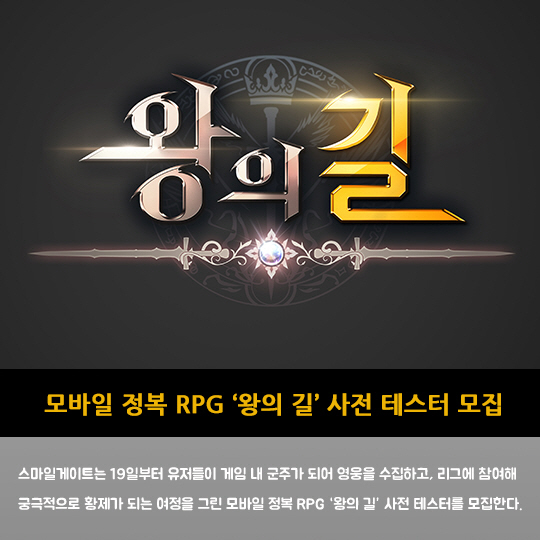 스마일게이트는 19일부터 유저들이 게임 내 군주가 되어 영웅을 수집하고, 리그에 참여해 궁극적으로 황제가 되는 여정을 그린 모바일 정복 RPG '왕의 길' 사전 테스터를 모집한다.