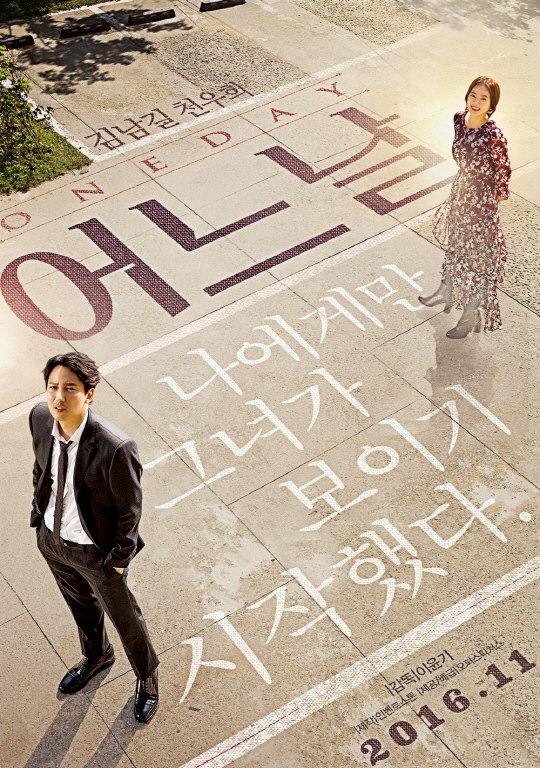 '어느날'은 혼수상태에 빠진 여자의 영혼을 보게 된 남자 강수와 뜻밖의 사고로 영혼이 되어 세상을 처음 보게 된 여자 미소가 서로 만나게 되면서 벌어지는 이야기를 담은 작품이다. 김남길, 천우희, 임화영이 가세했고 '남과 여' '사랑한다, 사랑하지 않는다' '멋진 하루'의 이윤기 감독이 메가폰을 잡았다. 오는 11월 개봉 예정이다.