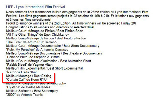 [스포츠조선 고재완 기자] 코미디 영화 '커튼콜'이 2016 리옹국제영화제에서 편집상을 수상하는 쾌거를 이뤘다.