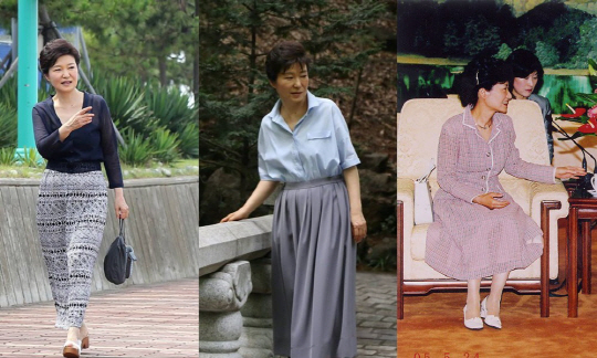 박근혜 대통령은 긴 기장감의 플리츠 스커트나 에스닉한 패턴 스커트로 편안한 룩을 완성했다. 공식 석상 속 트위드 소재의 투피스 또한 격조있는 패션을 완성한다.