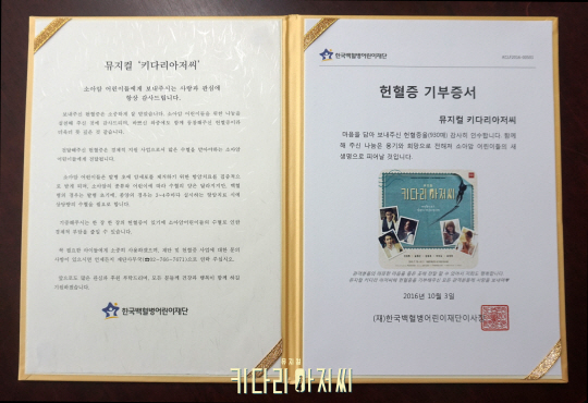 지난 3일 폐막한 뮤지컬 '키다리 아저씨'의 제작사 달 컴퍼니가 할인 이벤트를 통해 관객들에게 기부 받은 헌혈증 930매를 한국백혈병어린이재단에 전달했다.