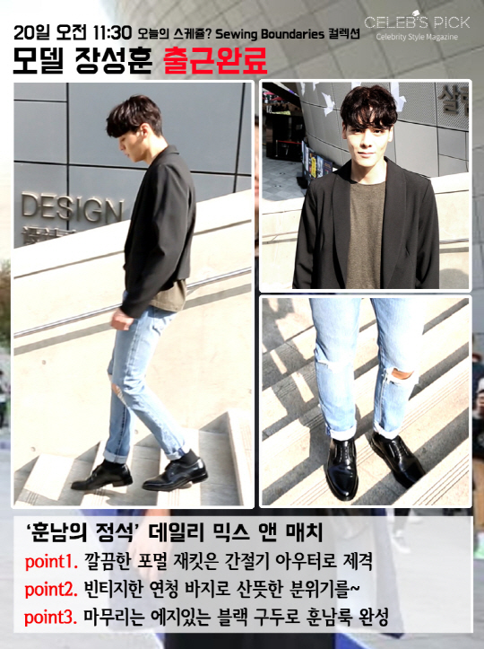 2016년 SS 서울컬렉션으로 데뷔한 신예 장성훈, 신예 답지 않은 댄디하고 시크한 재킷 룩을 선보이며 DDP에 흩어져 있던 여심을 한데로 모았습니다. 남자라면 누구나 하나쯤 갖고 있어야 할 짧은 길이의 포멀 댄디 재킷과 디스트로이드 포인트 데님 진이 트렌디하게 잘 어우러지네요. 살짝 롤업한 팬츠 사이로 보이는 블랙 삭스는 더할 나위 없이 매력적! 광택감 있는 구두가 엣지있는 훈남룩의 마무으리.