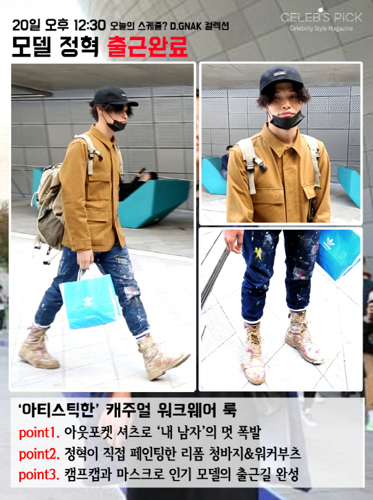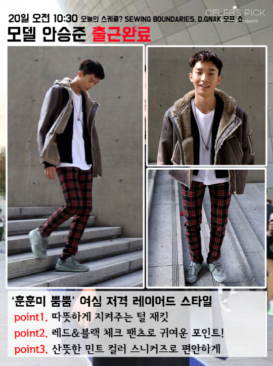 가을과 잘 어울리는 레이어드룩을 선보인 핫한 모델 안승준! 안승준은 내 남자친구 삼고 싶게 하는 여심 저격 훈훈 스타일링으로 수많은 사람들 속에서도 반짝반짝 빛났어요. 그는 흰 티셔츠에 카디건을 레이어드한 후, 따뜻한 털 재킷을 걸친 룩을 보여줬어요. 여기에 그가 밝힌 포인트는 바로 하반신에 있었는데요. 바로 레드와 블랙 컬러의 체크 패턴 바지와 산뜻한 민트 컬러 스니커즈로 포인트를 준 것입니다. 이 정도면 완벽하게 여심 저격할 만 하죠?