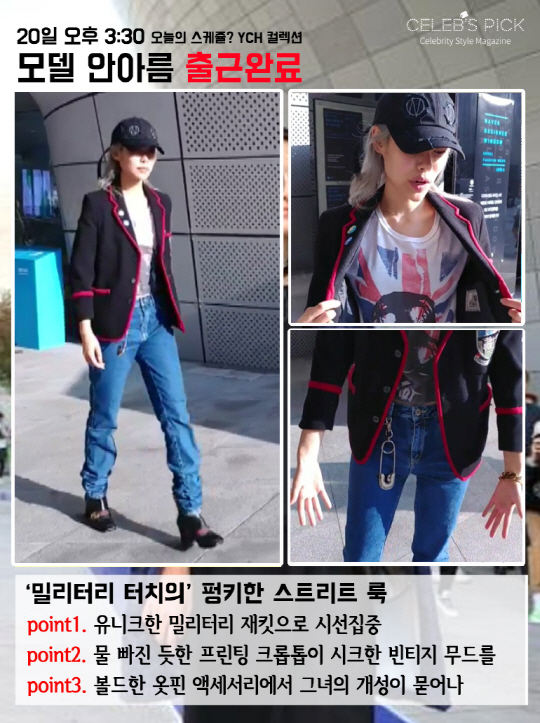 모델 안아름은 레드 포인트로 밀리터리 무드가 느껴지는 캐주얼 재킷을 선택했습니다. 눈에 띄는 아이템이라 기본 스타일에 매치해 데일리에 독특한 개성을 드러낼 수 있겠는데요. 여기에 물 빠진 듯한 프린팅 크롭 톱으로 펑키하면서도 빈티지한 포인트까지 더해줍니다. 그리고 눈에 띄는 유니크한 액세사리! 볼드한 옷 핀을 청바지에 연결해 패셔너블한 스트리트룩을 마무리했답니다.