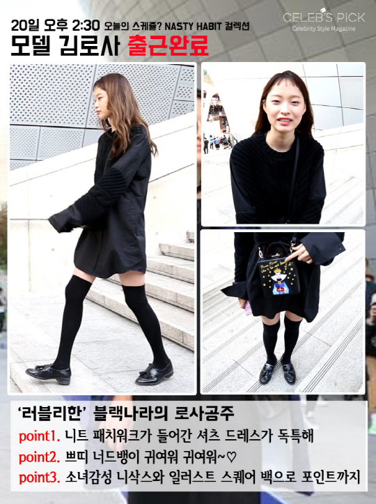 모델 김로사는 블랙 셔츠 드레스를 선택해 귀여운 분위기의 스타일링을 선보였는데요. 가까이서 보니 니트 패치워크가 들어간 드레스였어요. 가을엔 이런 포근한 텍스처가 가미된 아이템을 눈여겨 보는 것도 좋겠지요. 또 김로사 특유의 러블리한 에너지를 듬뿍 담은 포인트도 돋보입니다. 걸리시한 니삭스와 유니크한 일러스트가 담긴 스퀘어 쁘띠백을 매치해 패션위크 출근길을 완성!