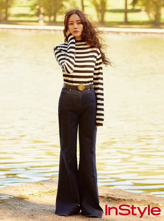또 다른 화보에서는 김효진은 볼드한 스트라이프 패턴 티셔츠에 트렌드 아이템인 부츠컷 데님을 매치, 완벽 비율을 뽐내며 패셔니스타로서의 면모를 드러내고 있다.