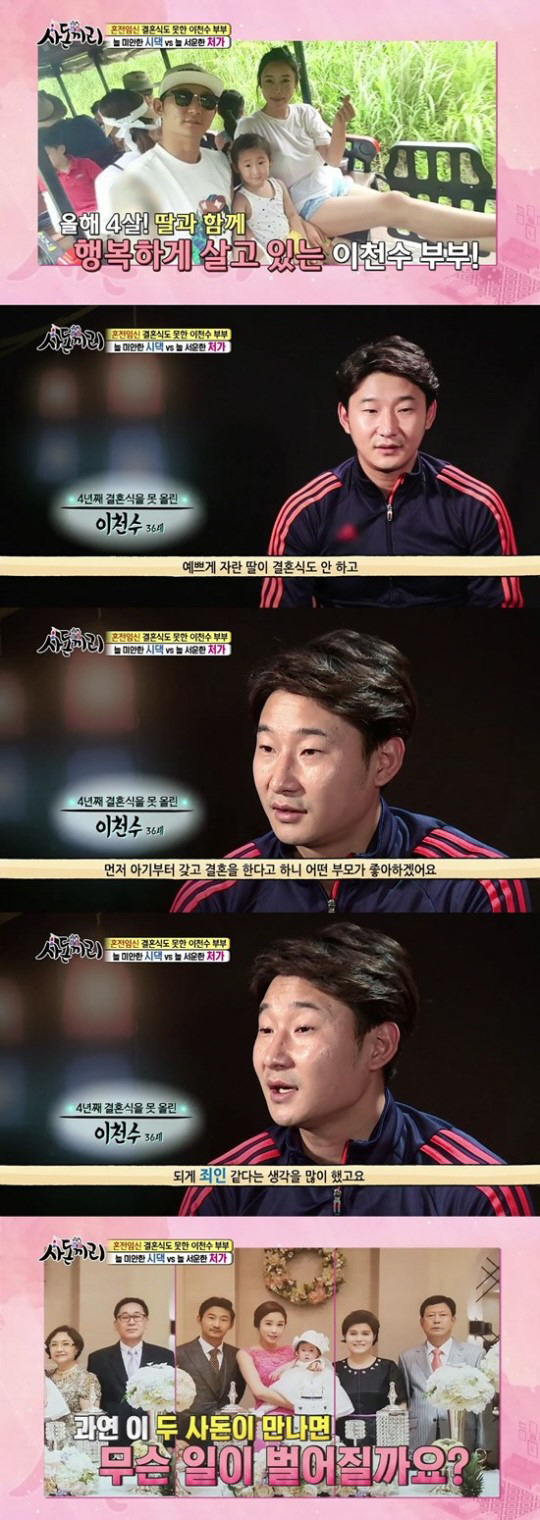 '결혼 4년차' 이천수·심하은 부부와 결혼식 문제를 안고 있는 두 사돈끼리의 만남은 26일(수) 밤 11시 방송에서 확인 가능하다. <스포츠조선닷컴>