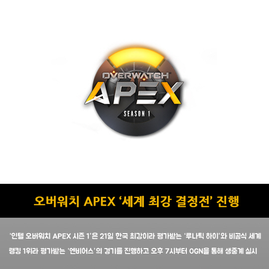 '인텔 오버워치 APEX 시즌 1'은 21일 한국 최강이라 평가받는 '루나틱 하이'와 비공식 세계 랭킹 1위라 평가받는 '엔비어스'의 경기를 진행하고 오후 7시부터 OGN을 통해 생중계 실시