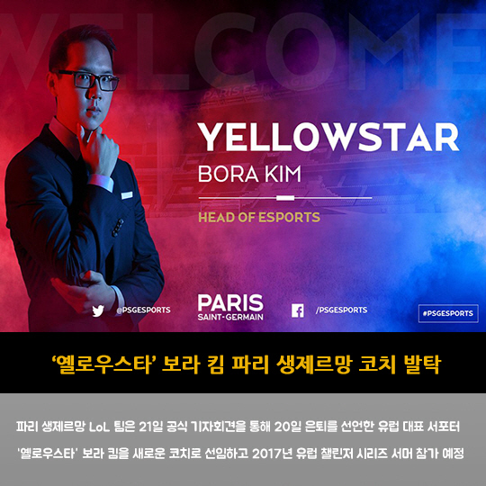 파리 생제르망 LoL 팀은 21일 공식 기자회견을 통해 20일 은퇴를 선언한 유럽 대표 서포터 '옐로우스타' 보라 킴을 새로운 코치로 선임하고 2017년 유럽 챌린저 시리즈 서머 참가 예정
