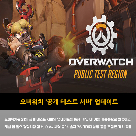 오버워치는 21일 공개 테스트 서버의 업데이트를 통해 게임 내 UI를 카툰풍으로 변경하고 레벨 업 필요 경험치량 감소, D.Va 체력 증가, 솔저 76 대미지 상향 등을 포함한 패치 적용