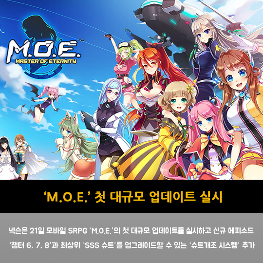 넥슨은 21일 모바일 SRPG 'M.O.E.'의 첫 대규모 업데이트를 실시하고 신규 에피소드 '챕터 6, 7, 8'과 최상위 'SSS 슈트'를 업그레이드할 수 있는 '슈트개조 시스템' 추가