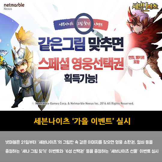 넷마블은 21일부터 '세븐나이츠'의 그림판 속 같은 이미지를 찾으면 영웅 소환권, 열쇠 등을 증정하는 '세나 그림 찾기' 이벤트와 '6성 선택권' 등을 증정하는 '세브나이츠 선물' 이벤트 실시