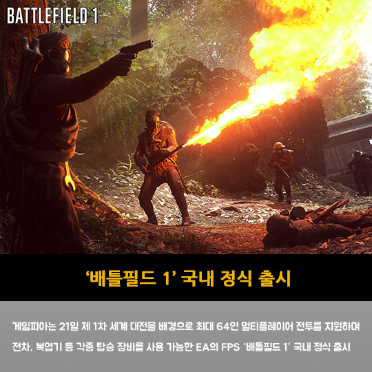 게임피아는 21일 제 1차 세계 대전을 배경으로 최대 64인 멀티플레이어 전투를 지원하며 전차, 복엽기 등 각종 탑승 장비를 사용 가능한 EA의 FPS '배틀필드 1' 국내 정식 출시