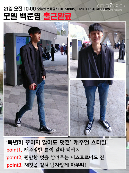 오늘 가장 먼저 만난 모델은 바로 백준영. 백준영은 특별히 화려하게 꾸미지는 않았지만, 그렇기 때문에 더욱 훈훈한 느낌을 내는 '현실 남친룩'을 보여줬습니다! 거의 모든 사람들이 옷장에 하나 쯤은 가지고 있을 법한 칼라 티셔츠와 데님 팬츠, 재킷, 스니커즈를 매치한 룩이었는데 백준영은 완벽한 모델핏과 기럭지로 찰떡 소화해냈습니다. 덕분에 DDP에 있는 모든 여자들의 시선을 확 사로잡았다죠? 자연스럽고 자유분방한 스타일링을 보여준 백준영이었습니다.