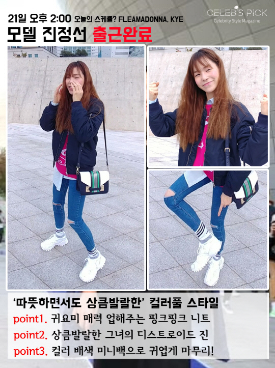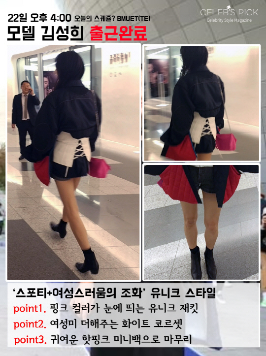 김성희는 오늘 만난 모델들 중 가장 유니크한 스타일링을 보여준 모델이었습니다. 스포티함과 여성스러움의 절묘한 조화로움을 보여준 모델 김성희. 핑크 배색 와이드 포켓이 달린 재킷으로 독특한 스타일을 보여줌과 동시에 화이트 코르셋을 함께 매치해 여성스러움까지 드러냈습니다. 쌀쌀한 날씨에도 불구하고 입은 핫팬츠는 그의 각선미를 한껏 강조해주는 역할을 했습니다.