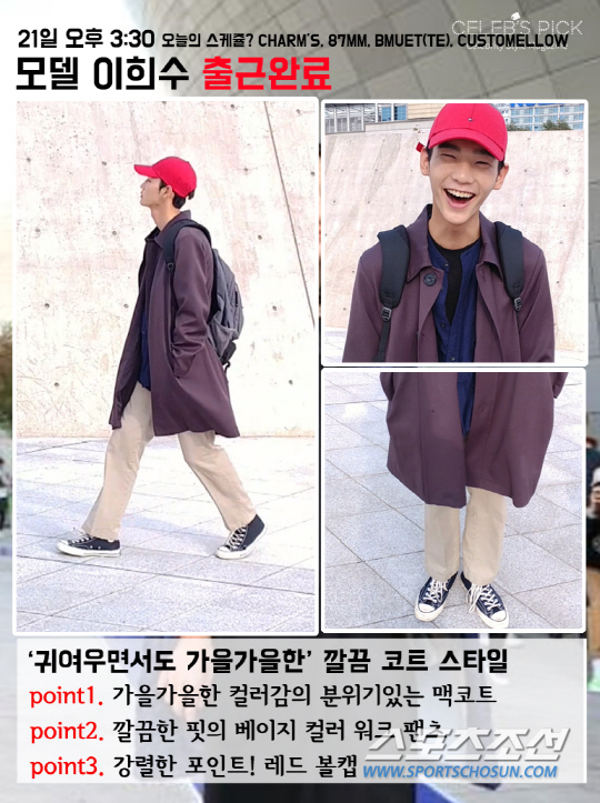 이번 패션위크에서 가장 핫한 바로 그 모델, 이희수! 이희수는 어린 나이에도 불구하고 이번 17 S/S 서울 패션위크에서 가장 많은 쇼에 서는 모델 1위로 선정될 만큼 요즘 가장 뜨거운 인기를 누리고 있는 모델입니다. 그런 그는 오늘 출근길에서 가을가을한 무드를 장착한 룩을 보여줘 눈길을 끌었는데요. 가을엔 역시 코트! 이희수는 가을과 잘 어울리는 딥퍼플 컬러의 맥코트로 분위기있는 룩을 완성했어요. 그 안에는 블랙 티셔츠와 네이비 셔츠를 매치해 깔끔한 스타일을 보여줬습니다. 딱 떨어지는 핏의 베이지 컬러 워크 팬츠 또한 이희수의 출근룩에 깔끔함을 더해준 아이템이었죠. 그는 마지막 포인트로 강렬한 레드 컬러의 볼캡을 써 귀여운 느낌까지 줬습니다.
