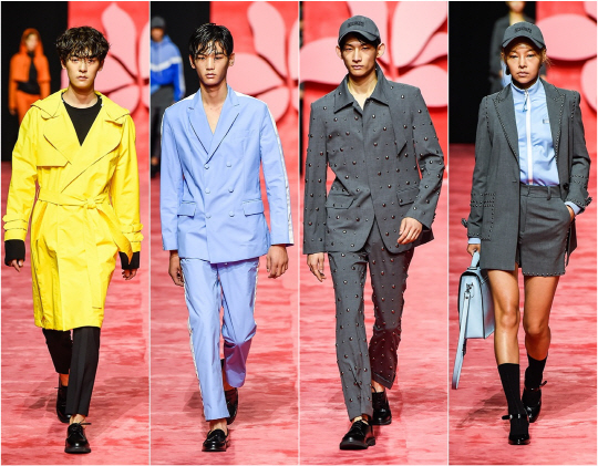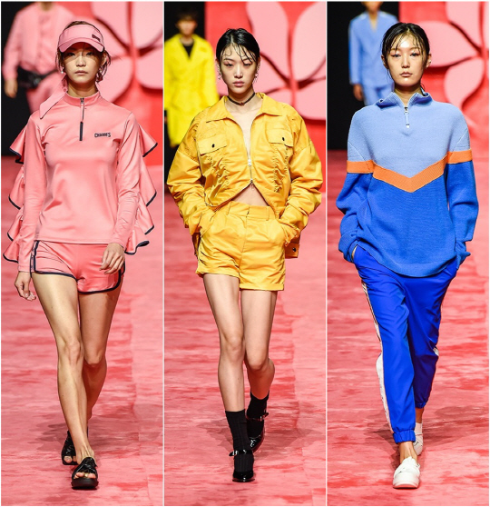 지루할 틈 없는 색채 봄 여름 시즌에 가장 빛날 만한 핑크, 옐로, 그린과 블루 등 싱그러운 색깔을 입힌 의상들이 주를 이뤘다. 마치 날개처럼 프릴 장식이 달린 트레이닝 수트, 셔링 장식의 재킷과 숏팬츠는 물론 컬러 조화가 살아있는 스포티브한 의상들은 젊음이 가진 에너지를 아낌없이 발산했다.