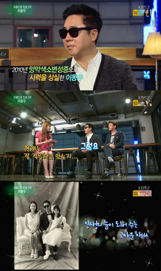 이동우는 2010년 망막색소변성증으로 시력을 잃은 상태다. 그는 현재 잘 적응을 하고 있냐는 질문을 받고 "그럼요. 사람 복이 많은 것 같다"면서 시력을 잃었지만 사람을 얻었다고 말했다.