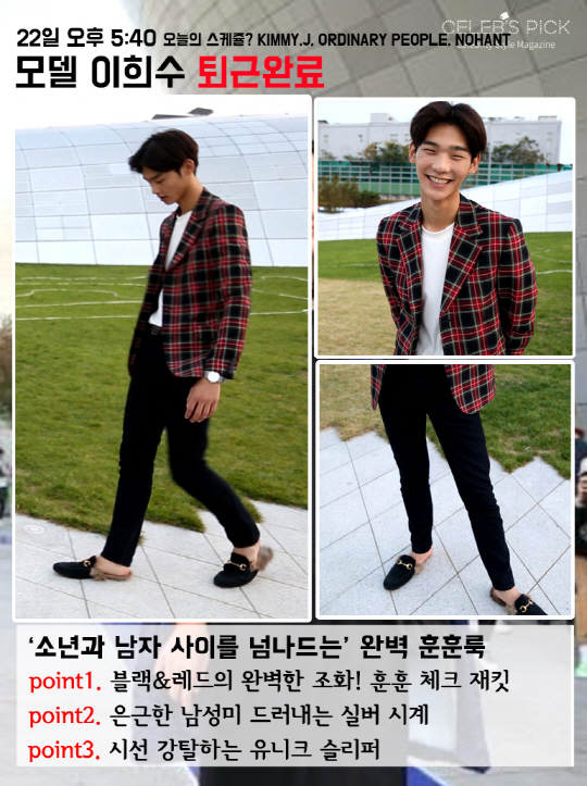 패션위크 기간 동안 출근길로 두 번째 만난 그는 처음 만났을 때와는 또 다른 패션으로 색다른 매력을 보여줬는데요. 오늘은 남자다움이 느껴지는 룩으로 DDP의 여심을 저격했습니다. 패션위크에 사람이 가장 많이 모이는 날이기 때문에 평소보다 조금 더 신경을 썼다고 수줍게 웃으며 밝힌 그의 패션에서 가장 눈에 띈 것은 역시나 재킷이었습니다. 조금 튀는 블랙&레드 체크 패턴 재킷을 입은 이희수는 재킷이 튀는 만큼 재킷 안은 무지 화이트 티셔츠와 검정색 바지로 균형을 맞춰줬습니다. 여기에 소매 밑으로 살짝 보이는 손목 시계는 은근한 남성미를 더해줬죠. 슬리퍼 또한 굉장히 독특했는데요. 언뜻 보면 로퍼처럼 보이는 퍼 슬리퍼가 하반신의 포인트가 되어줬습니다. 이렇게 이희수는 소년미 뿜어내는 얼굴로 남자다운 깔끔한 룩까지 완벽 소화하며 소년과 남자 사이를 자유자재로 넘나드는 완벽한 반전 매력을 보여줬습니다.