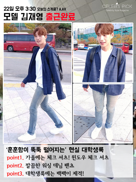내 주변에 있을 것만 같지만, 절대 존재하지 않는 훈훈한 선배룩의 정석을 보여준 모델 김재영. 그는 각종 드라마와 영화에 출연하며 배우로도 얼굴을 알리고 있는데요. 그런 김재영은 패션위크 마지막 날, 자연스러워 더욱 눈길이 가는 대학생룩을 선보였습니다. 화이트 무지 티셔츠에 워싱 데님 팬츠를 매치한 그는 정말 '청바지에 흰 티'만으로도 빛이 나는 것이 무엇인지를 몸소 보여줬습니다. 여기서 끝이 아니죠. 이 위에 간단하게 걸친 체크 셔츠는 포인트가 되어 가을스러운 느낌을 더해줬습니다. 마지막으로 블랙 백팩까지 메준 그는 정말 순정 만화에서 막 튀어나온 듯한 비주얼로 여심을 흔들었습니다.