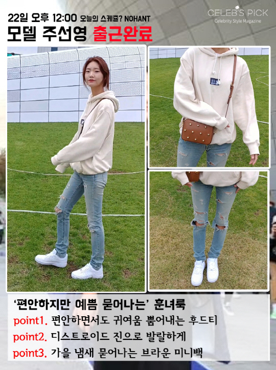주선영은 청순미 넘치는 미모와 잘 어울리는 내추럴 룩을 보여줬습니다. 너무 꾸미지 않아 더욱 아름다운 패션을 보여준 주선영. 그녀는 귀여운 흰색 후드티에 디스트로이드 진을 매치해 발랄한 분위기를 자아냈습니다. 신발은 흰 스니커즈를 매치해 정말 편안한 출근길룩을 보여줬죠. 하지만 그녀의 출근길룩에도 포인트는 존재하겠죠? 그 포인트는 바로 가방이었습니다. 가을가을한 브라운 컬러에 귀여운 구슬이 달린 가방은 그녀의 귀여움을 한껏 끌어올려줬습니다.
