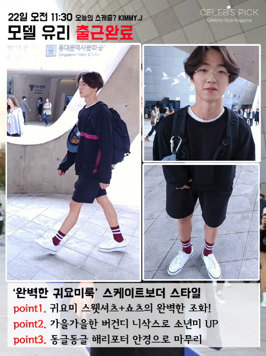 패션위크의 마지막 날, 가장 먼저 만난 모델은 바로 떠오르는 모델 유리! 유리는 스슌셔츠와 반바지로 귀여움 넘치는 스트리트 패션을 보여줬는데요. 어눌한 한국어로 조금은 귀엽게 자신의 출근길룩을 설명하는 그와 아주 잘 어울리는 귀요미 패션이었습니다. 특히 버건디 보이삭스가 이 귀요미룩의 정점을 찍어줬어요. 여기에 동그란 해리포터 안경까지 더해주니 유리의 소년미는 더욱 넘쳐 흘렀습니다. 유리가 이 패션을 한 마디로 정의해줬는데요. 바로 '스트리트 스케이트보더 스타일'입니다.