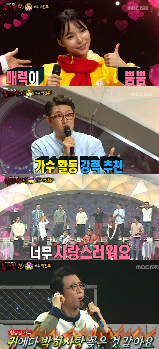 다른 연예인 판정단들은 "지금 진주씨 엄청 빛이 난다" "진짜 진주같다" "귀에 박하사탕을 꽂은 것 같다. 목소리가 너무 시원하다" 등의 말로 박진주에게 찬사를 보냈다.