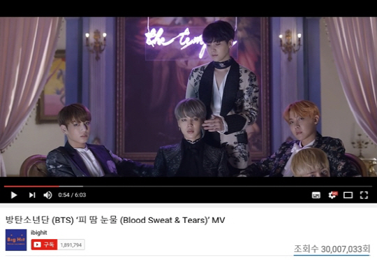 [스포츠조선 조윤선 기자] 방탄소년단의 신곡 '피 땀 눈물' 뮤직비디오가 3천만 뷰를 돌파하며 전 세계 식을 줄 모르는 인기행진을 이어가고 있다.
