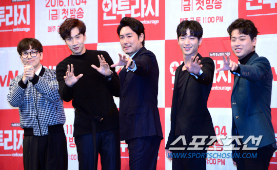25일 오후 서울 강남구 논현동 임피리얼팰리스호텔에서 tvN 금토드라마 '안투라지' 제작발표회가 열렸다. 조진웅, 서강준, 이광수가 출연하는 '안투라지'는 연예계를 그리는 이야기로, 미국 HBO가 2004년부터 2011년까지 방송한 동명의 드라마를 리메이크했다. 11월4일 방송을 앞두고 사전제작을 통해 중국, 일본, 싱가포르, 말레이시아 등 아시아 12개국에서 동시 공개된다. 제작발표회에 참석해 포즈를 취하고 있는 이동휘, 이광수, 조진웅, 서강준, 박정민. 송정헌 기자 songs@sportschosun.com/2016.10.25 |