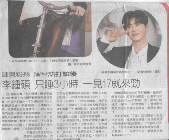 [스포츠조선 이유나 기자]배우 이종석이 대만 현지 유력 방송사와 신문사 메인 뉴스를 일제히 장식, 그의 '한류 파워'를 실감하게 했다.