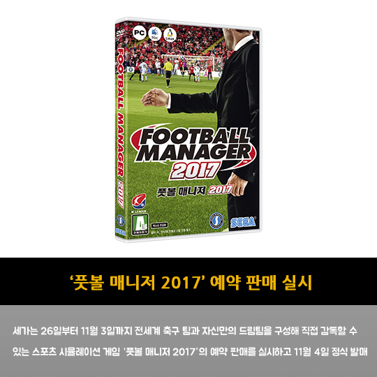 세가는 26일부터 11월 3일까지 전세계 축구 팀과 자신만의 드림팀을 구성해 직접 감독할 수 있는 스포츠 시뮬레이션 게임 '풋볼 매니저 2017'의 예약 판매를 실시하고 11월 4일 정식 발매