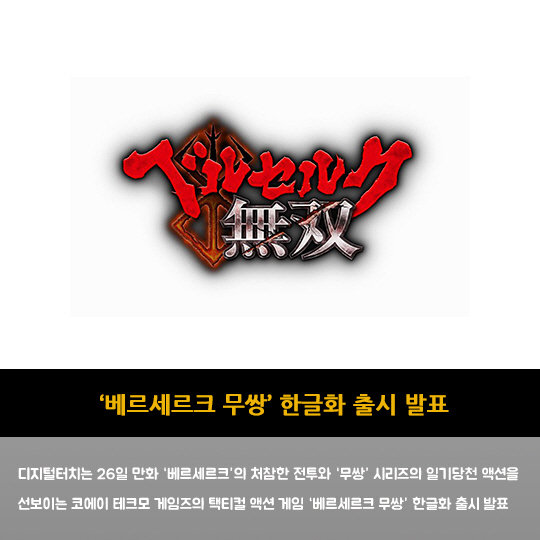 디지털터치는 26일 만화 '베르세르크'의 처참한 전투와 '무쌍' 시리즈의 일기당천 액션을 선보이는 코에이 테크모 게임즈의 택티컬 액션 게임 '베르세르크 무쌍' 한글화 출시 발표
