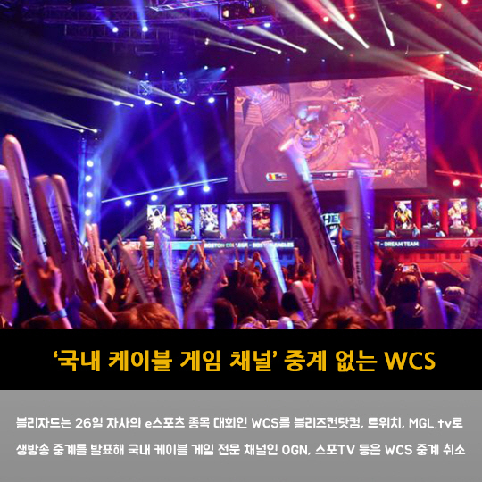 블리자드는 26일 자사의 e스포츠 종목 대회인 WCS를 블리즈컨닷컴, 트위치, MGL.tv로 생방송 중계를 발표해 국내 케이블 게임 전문 채널인 OGN, 스포TV 등은 WCS 중계 취소