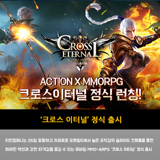 이펀컴퍼니는 26일 광활하고 자유로운 오픈필드에서 높은 조작감의 슬라이드 컨트롤을 통한 화려한 액션과 강한 타격감을 즐길 수 있는 모바일 MMO-ARPG '크로스 이터널' 정식 출시