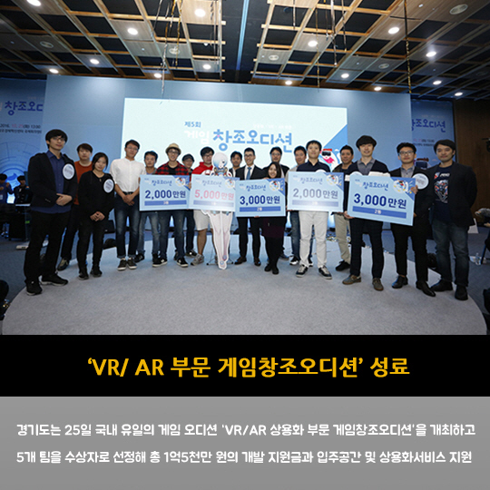 경기도는 25일 국내 유일의 게임 오디션 'VR/AR 상용화 부문 게임창조오디션'을 개최하고 5개 팀을 수상자로 선정해 총 1억5천만 원의 개발 지원금과 입주공간 및 상용화서비스 지원