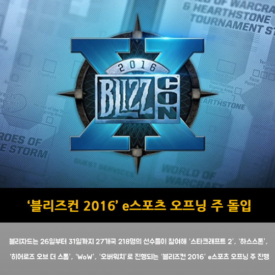 블리자드는 26일부터 31일까지 27개국 218명의 선수들이 참여해 '스타크래프트 2', '하스스톤', '히어로즈 오브 더 스톰', 'WoW', '오버워치'로 진행되는 '블리즈컨 2016' e스포츠 오프닝 주 진행