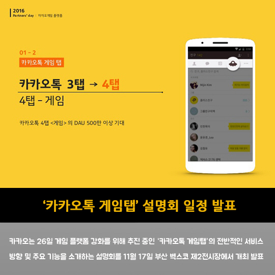 카카오는 26일 게임 플랫폼 강화를 위해 추진 중인 '카카오톡 게임탭'의 전반적인 서비스 방향 및 주요 기능을 소개하는 설명회를 11월 17일 부산 벡스코 제2전시장에서 개최 발표
