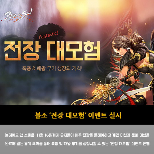 블레이드 앤 소울은 11월 16일까지 유저들이 매주 전장을 플레이하고 개인 미션과 문파 미션을 완료해 받는 용기 주화를 통해 폭풍 및 패왕 무기를 성장시킬 수 있는 '전장 대모험' 이벤트 진행