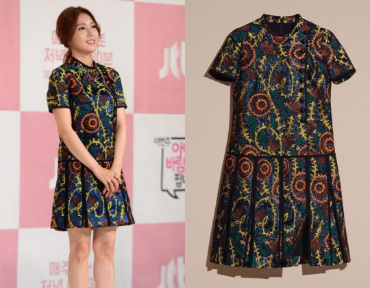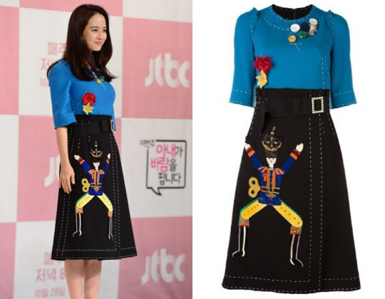 볼드하게 보여지는 스티치, 병정 모양의 패치, 상의 부분에 플라워와 버튼 장식 등, 송지효의 드레스는 마치 장난감을 보는 듯 하다. 블루와 블랙 컬러로 다소 심플하고 단조로운 컬러 배색이지만, 컬러풀한 패치나 흰 스티치 등 디테일이 살아있어 드레스에 재미를 더했다.