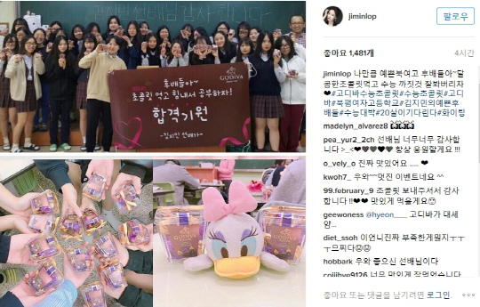 앞서 김지민은 수능을 앞둔 고3 후배들을 응원하기 위해 직접 초콜릿을 준비하는 등 깜짝 이벤트를 펼쳤다. 후배들은 예상치 못한 선배 김지민의 선물에 감동했고 감사의 인사를 사진으로 대신해 전했다는 후문.