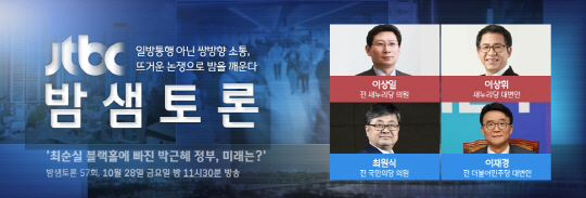 오는 28일(금) 밤 11시 30분에 방송될 JTBC '밤샘토론'은 '최순실 블랙홀에 빠진 박근혜 정부, 미래는?'이라는 주제로 대통령의 대국민 사과에도 점차 커져가는 최순실 게이트가 정국에 미칠 파장에 대해 다룬다. 최순실을 둘러싼 각종 의혹, 탄핵 등을 요구하며 들끓고 있는 민심, 관련 해법 등에 대해 이야기할 예정이다.