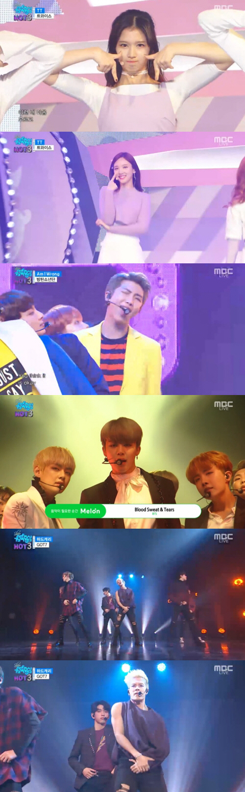 대세 그룹 방탄소년단은 특별한 무대를 꾸몄다. 방탄소년단 특유의 파워풀한 에너지와 자유분방한 매력을 드러낸 'Am I Wrong'과 전에 없던 섹시미와 칼군무가 돋보이는 '피 땀 눈물'로 화려한 무대를 선보였다. 3주 연속 'HOT3'로 선정된 갓세븐은 강력한 퍼포먼스로 여심을 '하드캐리'했다.