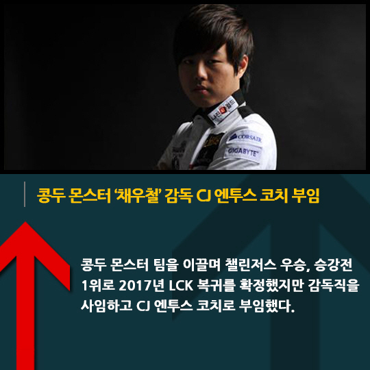 콩두 몬스터 팀을 이끌며 챌린저스 우승, 승강전 1위로 2017년 LCK 복귀를 확정했지만 감독직을 사임하고 CJ 엔투스 코치로 부임했다.