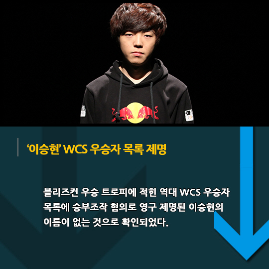 블리즈컨 우승 트로피에 적힌 역대 WCS 우승자 목록에 승부조작 혐의로 영구 제명된 이승현의 이름이 없는 것으로 확인되었다.
